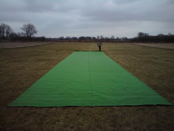 Ein preiswerterer Versuch ist das Auslegen von Kunstrasen. Das ist temporär und billig, wenn man ein Angebot im Baumarkt abwarten kann. Ausserdem hat es den Vorzug, dass die Bahn immer nach der Windrichtung ausgelegt werden kann.