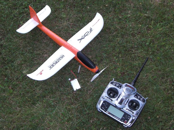 Der Fox von Multiplex ist eigentlich ein Wurfsegler für Kinder. Er kann jedoch, wie hier, durch leichte RC-Komponenten fergesteuert werden. Der Bauaufwand hält sich in Grenzen und der Spaß am Fliegen kommt nicht zu kurz. Das Modell wird erstaunlich schnell und ist sehr wendig. Durch den Schub von ca. 160g kann das Modell fast senkrecht steigen. Im Rückenflug ist das Modell recht kippelig, aber noch gut beherschbar. Es ist alles an Kunstflug fliegbar, was ohne Seitenruder zu realisieren ist. Die Flugzeit liegt bei den kleinen 350mAh Akkus bei etwa 5-6min, je nach Gasanteil. Mit größeren, z.B. 800mAh, wären 10min drin.