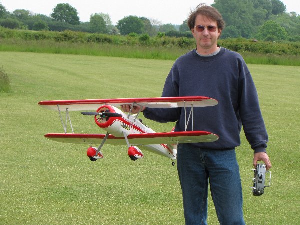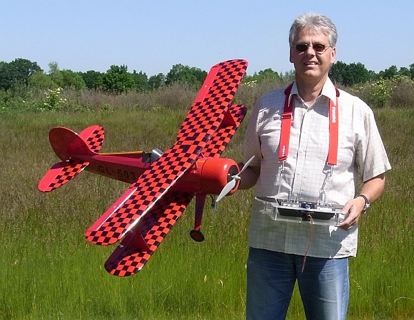 Der Doppeldecker ist eine Stearman PT-17 von Kyosho. Komplett Balsa, fast kein Sperrholz, mit Folie bespannt. Spannweite 1270mm, Gewicht mit 3s2p 1700mAh und Ø35x39mm BLDC ca. 2700g. Strom 40A mit Prop 11x6, Regler Jeti 70A. Die Akkus sind im Motorträger untergebracht, um auf Trimmgewichte verzichten zu können. Fliegt neutral mit recht großem Geschwindigkeitsbereich, nur in steilen Kurven (besonders in Bodennähe) sollte man nicht zu langsam werden.